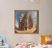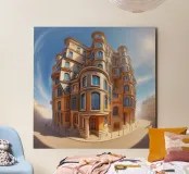 Una struttura architettonica surreale con caratteristiche curve e distorte, che fonde stili classici e moderni, si erge sotto un cielo blu brillante. La strada di ciottoli e la luce soffusa del sole esaltano l'atmosfera stravagante e onirica.