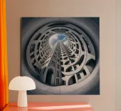Un progetto architettonico fantasioso che mostra una struttura circolare in cemento vista dal basso, enfatizzando simmetria, profondità e creatività. Il design urbano futuristico crea un'esperienza visiva surreale con le sue forme geometriche e il cielo aperto.