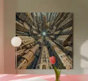 Una surreale visione fisheye di strutture urbane torreggianti con dettagli intricati e modelli simmetrici, che convergono verso un cielo radioso. Il design architettonico stratificato evidenzia l'innovazione moderna e la creatività artistica.