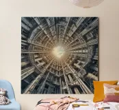 Un design architettonico intricato che forma una struttura a tunnel con simmetria a raggiera, che converge verso una luce incandescente al centro. La prospettiva crea profondità e un'estetica ipnotica e futuristica.