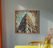 Una stravagante rappresentazione di un edificio storico con dettagli intricati circondato da un cielo vibrante pieno di frutta e verdura galleggianti. La composizione surreale fonde architettura e fantasia per una visione creativa e colorata.