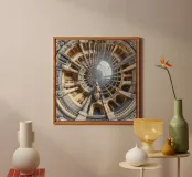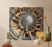 Questa immagine mostra un'intricata architettura circolare con colonne di pietra ornate, una statua centrale e un soffitto di vetro. La prospettiva surreale crea un effetto tunnel, attirando lo sguardo verso il centro della composizione.