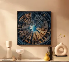 Questa immagine raffigura un'impressionante disposizione architettonica circolare con alti edifici classici modernizzati che convergono verso il cielo. Una statua prominente al centro esalta la prospettiva drammatica sotto un cielo azzurro e nuvoloso.