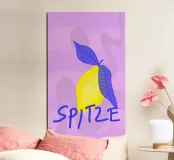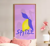 Limone felice con foglie blu e scritta blu "SPITZE" su onde viola. Un disegno spiritoso con un messaggio positivo.