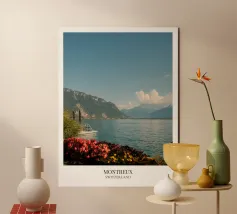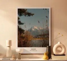 Una frizzante giornata di primavera sulle rive del Lago di Thun, con le cime innevate delle Alpi Bernesi. Questo paesaggio tranquillo è caratterizzato da acque calme, un incantevole villaggio svizzero e montagne maestose sotto un cielo azzurro e limpido. Catturato con una fotocamera Fujifilm in toni naturali - ideale per gli amanti dell'arte, i viaggiatori e gli appassionati di fotografia alpina.
