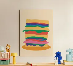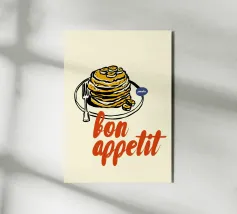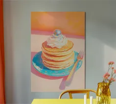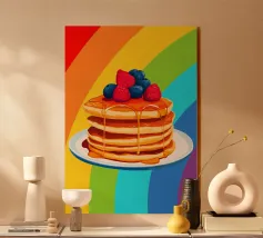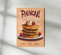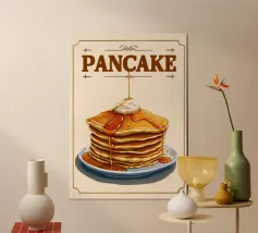 Una pila di pancake conditi con sciroppo e una guarnizione è rappresentata in uno stile minimalista di line art blu. Il design enfatizza la semplicità e le immagini a tema colazione.