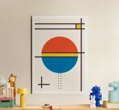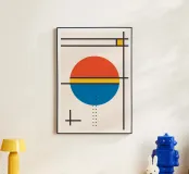 Un poster astratto fortemente ispirato al lavoro del maestro del Bauhaus Wassily Kandinsky, caratterizzato da un cerchio dominante e segmentato nei colori primari rosso (vermiglio) e blu, diviso orizzontalmente da una sottile striscia gialla. La composizione è costruita su una delicata griglia di linee nere sottili che si intersecano, con un piccolo quadrato giallo, linee tratteggiate e una croce nera che aggiungono dettagli minimalisti. Questo pezzo geometrico mostra magnificamente l'equilibrio tra colore, linea e forma caratteristico dell'arte astratta. Questo download digitale di alta qualità (7000x5000 pixel, 300 dpi) offre una riproduzione nitida e di livello museale.