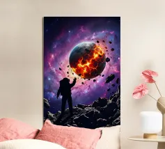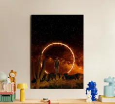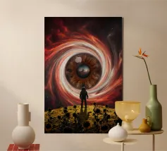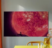 Questo poster mostra un astronauta in piedi di fronte a un gigantesco sole incandescente. La superficie del sole è rappresentata con intense tonalità di rosso e arancione, mentre l'astronauta appare piccolo e sperduto nell'enorme sfondo. Questa immagine cattura la potenza e la grandezza della nostra stella e simboleggia la minuscola dimensione dell'uomo rispetto all'incommensurabile vastità dell'universo. Ideale per chi ama il fascino dello spazio e delle forze della natura.
