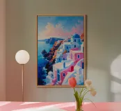 Questo squisito dipinto cattura l'alba sulle cupole blu a cascata e sugli edifici imbiancati di Oia, a Santorini. La tecnica impressionista mette in risalto i caldi toni pastello del cielo dell'alba, armonizzandoli con i blu freddi del mare e dell'architettura. Le scogliere frastagliate e le acque tranquille esaltano l'accattivante bellezza dell'isola, creando un'opera d'arte che celebra la serenità e il fascino vibrante della destinazione più iconica della Grecia. Questo capolavoro è un omaggio all'eleganza senza tempo e all'ispirazione artistica di Santorini.