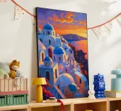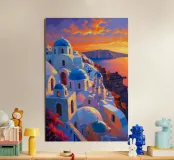 Le iconiche chiese dalle cupole blu di Santorini si crogiolano sotto un tramonto spettacolare. Le vivaci tonalità dell'arancio e del viola si fondono perfettamente con le serene acque del Mar Egeo, creando uno scenario mozzafiato. I fiori di bougainvillea ricadono a cascata sui tradizionali edifici imbiancati a calce, esaltandone il fascino idilliaco. Questo splendido dipinto a olio cattura il romanticismo e la tranquillità della scena più pittoresca di Santorini. Ogni dettaglio, dalle cupole alle abitazioni sulla scogliera, irradia calore e maestria, perfetti per evocare la voglia di viaggiare.