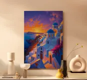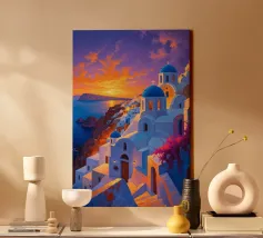 Le sfumature del tramonto illuminano le iconiche chiese dalle cupole blu e l'architettura bianca a cascata di Santorini. Adagiato su scogliere spettacolari, questo capolavoro trasporta gli spettatori in un tranquillo paradiso mediterraneo. La ricca tavolozza di cieli arancioni e rosa si riflette sulle serene acque del Mar Egeo, mentre i dettagli intricati delle chiese e dei sentieri creano un equilibrio armonioso di tradizione e bellezza. Il dipinto cattura l'essenza senza tempo del fascino di Santorini, perfetto per chi desidera una fetta di paradiso greco.