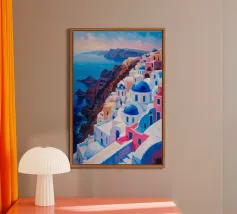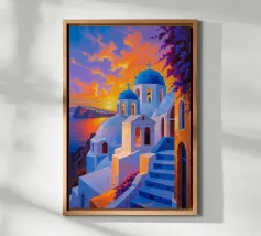 Le sfumature del tramonto illuminano le iconiche chiese dalle cupole blu e l'architettura bianca a cascata di Santorini. Adagiato su scogliere spettacolari, questo capolavoro trasporta gli spettatori in un tranquillo paradiso mediterraneo. La ricca tavolozza di cieli arancioni e rosa si riflette sulle serene acque del Mar Egeo, mentre i dettagli intricati delle chiese e dei sentieri creano un equilibrio armonioso di tradizione e bellezza. Il dipinto cattura l'essenza senza tempo del fascino di Santorini, perfetto per chi desidera una fetta di paradiso greco.