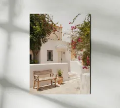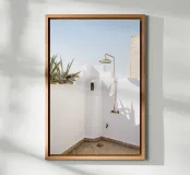 Escape to a bohemian paradise with this stunning photograph of a white outdoor shower on a sunlit rooftop in Marrakech. The minimalist design, with its clean lines and natural textures, perfectly blends with the warm Moroccan sun, creating a tranquil oasis high above the city. Surrounded by white walls and terracotta tiles and a gentle breeze, this serene space evokes a sense of freedom and relaxation. Ideal for infusing your home with the laid-back elegance of Moroccan style, this image captures the beauty of outdoor living and the spirit of Marrakech’s timeless charm.
