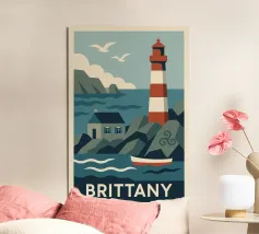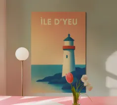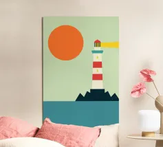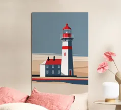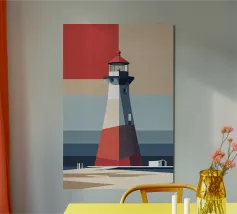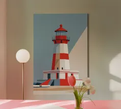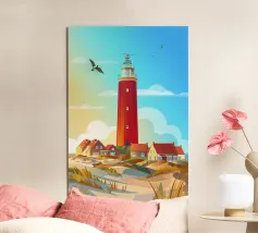 Questa opera d'arte modernista presenta il faro di Hörnum come una struttura audace e dinamica, che enfatizza gli angoli acuti e le forme astratte. In equilibrio tra realismo e astrazione, il faro è semplificato in suggestive bande rosse e bianche, sullo sfondo di un cielo blu intenso e di una sabbia strutturata. Il gioco di campi di colore e ombre della composizione crea un senso di profondità, rendendolo un tributo contemporaneo al patrimonio marittimo e alla bellezza costiera di Sylt.