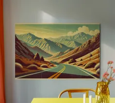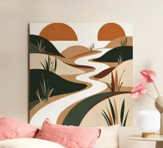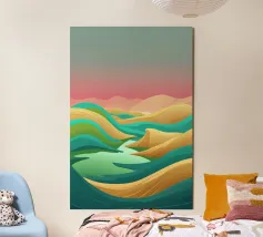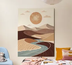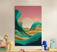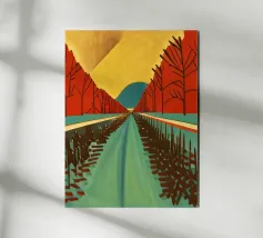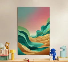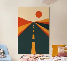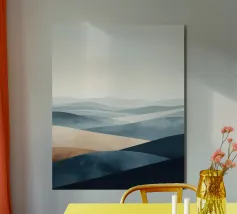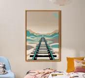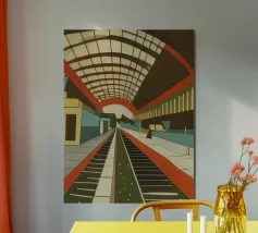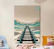 Questa rappresentazione artistica cattura l'iconica linea ferroviaria di Sylt con un approccio minimalista e astratto. La ferrovia si estende all'infinito verso l'orizzonte, fondendosi perfettamente con le morbide dune e le sfumature oceaniche. L'opera enfatizza la transizione senza soluzione di continuità tra le strutture costruite dall'uomo e il paesaggio costiero circostante. I toni tenui del beige, del verde acqua e del marrone sabbioso conferiscono all'immagine una qualità onirica, riecheggiando l'essenza tranquilla e potente del Mare del Nord. La composizione attira lo sguardo lungo i binari, evocando un senso di nostalgia, solitudine e la promessa di un viaggio senza fine.