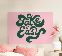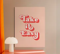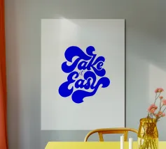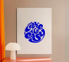 Un vivace disegno tipografico in stile retrò con la frase "Take It Easy" in grassetto, con caratteri ispirati agli anni '70. Il caldo mix di rosso, blu e verde menta con accenti di stelle aggiunge un'atmosfera giocosa e nostalgica, perfetta per un'estetica rilassata ed elegante. Un pezzo elegante e nostalgico che irradia calma e gioia. Creato da showmemars