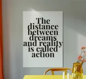 "Le parole 'La distanza tra i sogni e la realtà si chiama azione' sono disposte in un layout tipografico di grande impatto visivo, che sottolinea il potere di agire per raggiungere gli obiettivi. Il testo è audace e d'impatto, su uno sfondo pulito e minimalista, che crea un senso di motivazione e determinazione",
