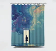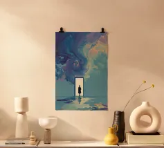 Questa suggestiva opera d'arte cattura la silhouette di una figura solitaria in piedi in un portale luminoso, che guarda in un cosmo vorticoso di colori vibranti e marmorizzati. Le fluide transizioni di blu, viola e gialli tenui evocano un senso di introspezione e trascendenza. La composizione suggerisce un portale tra il mondo interiore e l'ignoto, una rappresentazione poetica dell'immaginazione, della speranza e del potere tranquillo della solitudine. Le texture sognanti e pittoriche aggiungono profondità e movimento, invitando gli spettatori a entrare nel proprio spazio contemplativo.