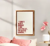 "La citazione "THEY WILL JUDGE YOU ANYWAY, SO KEEP GOING", impilata su più righe, è resa in un font serif e in grassetto con una tonalità di rosso intenso su uno sfondo morbido e bianco, che trasmette un messaggio di resilienza e perseveranza di fronte alle critiche",