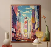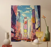 Questa vibrante opera d'arte cattura l'energia elettrica di Times Square a New York. Cartelloni pubblicitari colorati, strade affollate e gli iconici taxi gialli riempiono la scena, creando un'atmosfera cittadina dinamica. Con tinte vivaci e uno stile illustrativo moderno, celebra il battito della vita urbana e lo spirito senza fine di New York.