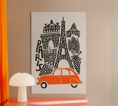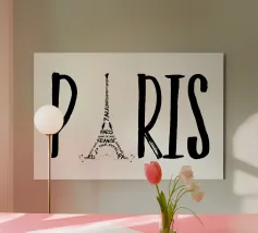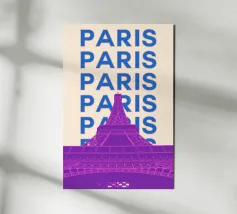 Il famoso simbolo di Parigi, la Torre Eiffel, in un design molto moderno. Lavoro artistico con elementi tipografici.