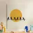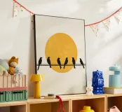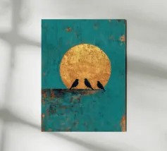 Un'illustrazione minimalista che raffigura sagome di uccelli appoggiati su un filo di ferro davanti a un grande cerchio giallo che evoca un tramonto. Questo disegno puro e poetico gioca sui contrasti per creare un'atmosfera pacifica e contemplativa. Perfetto per catturare la bellezza della natura con semplicità, aggiungendo un tocco elegante e senza tempo a uno spazio o a un progetto visivo.
