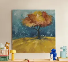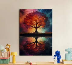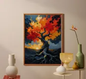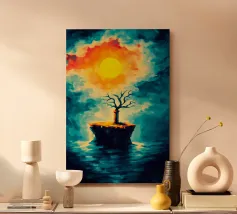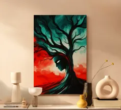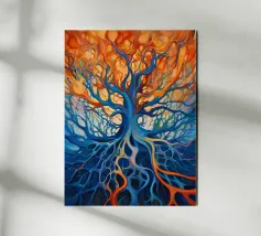 Questo affascinante dipinto a olio presenta una drammatica interpretazione astratta di un albero inghiottito da fiamme vibranti. La ricca tecnica di impasto crea un incredibile senso di consistenza e movimento, con spesse pennellate di arancioni, rossi e gialli infuocati che formano la chioma incandescente dell'albero. Il tronco e le radici scure e nodose ancorano l'inferno a un cielo cupo e tempestoso, reso con blu profondi, grigi e accenni di un minaccioso bagliore arancione all'orizzonte. Questo pezzo evoca potenti emozioni di passione, distruzione e resilienza, rendendolo un'aggiunta davvero unica e sorprendente a qualsiasi collezione d'arte.