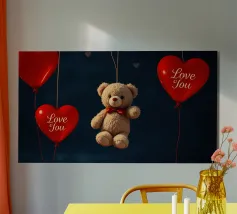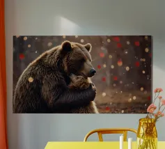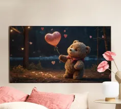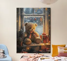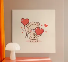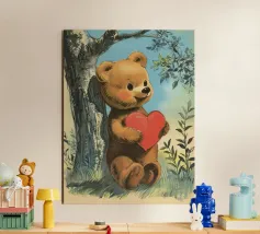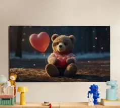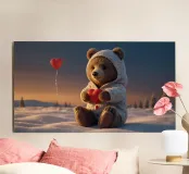 Un orsacchiotto con un'accogliente felpa con cappuccio stringe un cuore in una terra invernale alluminio dibond