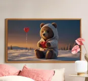 Un simpatico orsacchiotto vestito con un'accogliente felpa con cappuccio siede nella neve, tenendo gioiosamente un cuore rosso mentre un palloncino si muove nell'aria fresca della sera sotto un tramonto colorato.