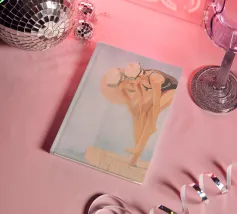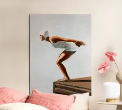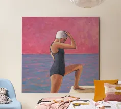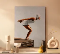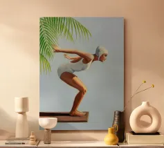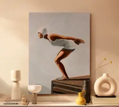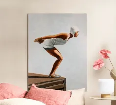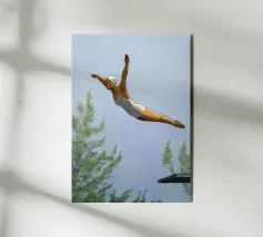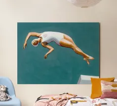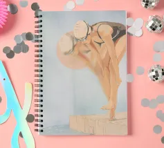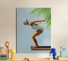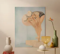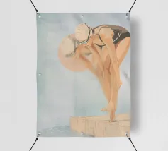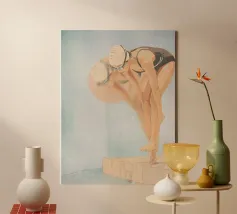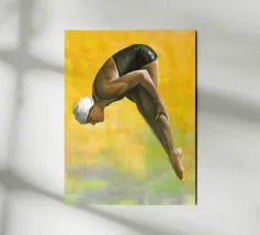Un'illustrazione dinamica, in stile fumetto, che cattura una nuotatrice al rallentatore mentre inizia a saltare dal bordo della piscina. Con linee decise e pennellate disinvolte, la scena fonde energia ed eleganza, congelando il momento del volo in uno sprazzo di colore e movimento espressivo.