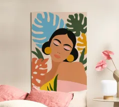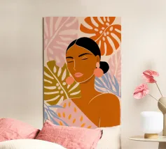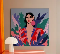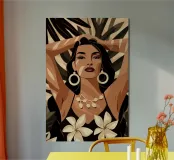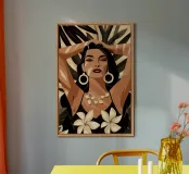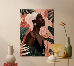 Questo poster espressivo combina la sensualità tropicale stilizzata con la raffinatezza grafica. Con potenti tonalità beige boho e contrasti netti, ricorda l'estetica dell'Art Déco e le illustrazioni iconiche della moda. La posa sicura e i dettagli floreali aggiungono fascino e forza al motivo: una dichiarazione femminile esotica ed elegante. Ideale per ambienti moderni e per chi ha un senso di stile e di vagabondaggio: una volta nei mari del sud, non si torna più indietro.