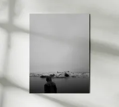 Un vasto paesaggio primordiale riposa sotto un cielo pesante e cupo. Questa fotografia drammatica cattura lo spirito indomito della natura selvaggia islandese, dove montagne lontane e innevate vegliano su una pianura vuota. I rovesci di pioggia che passano attraversano le cime scoscese, contribuendo alla bellezza atmosferica e lunatica della scena. Un potente tributo alle forze selvagge ed elementari della natura, questo pezzo è una finestra su un mondo di epica solitudine e di dimensioni mozzafiato. Una dichiarazione perfetta e contemplativa per qualsiasi spazio.