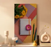 Uno spazio di lavoro colorato con un taccuino con un fiore alluminio dibond