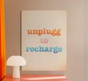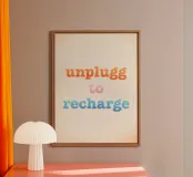 "Unplug to Recharge", tipografia minimalista che invita a fare una pausa e a ricaricare le batterie. Questo disegno è un promemoria per disconnettersi consapevolmente dalla vita digitale quotidiana e ricaricare le batterie. Ideale per la camera da letto, l'ufficio o il rifugio creativo. Una dichiarazione di stile per una maggiore consapevolezza nella vita quotidiana.