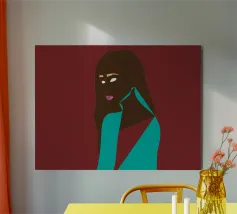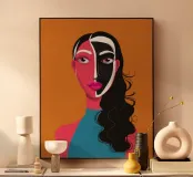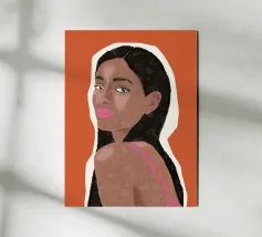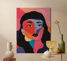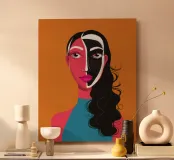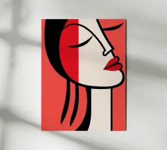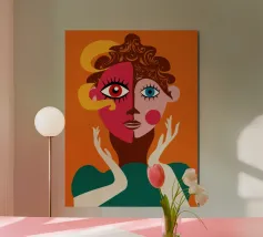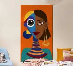 Un suggestivo ritratto astratto di un volto di donna, diviso in due metà, una nera e una bianca, con labbra rosse e capelli fluenti su un caldo sfondo arancione.