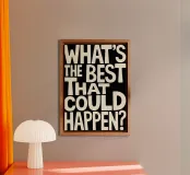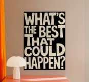 Design tipografico con la scritta "WHAT'S THE BEST THAT COULD HAPPEN?" in lettere maiuscole grandi e decise color crema su sfondo nero. Impilate verticalmente e leggermente sfalsate, le lettere creano una dichiarazione moderna, accattivante e potente.