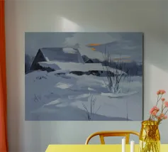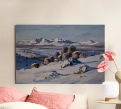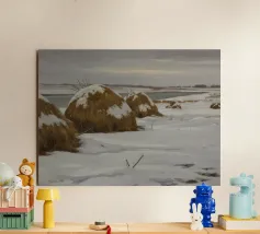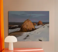A stark yet beautiful winter landscape centered on two prominent haystacks standing resiliently in a vast, snow-covered field, with a line of bare trees in the distance under a muted, overcast sky.