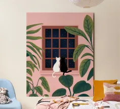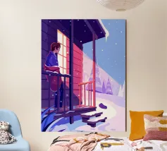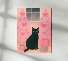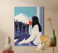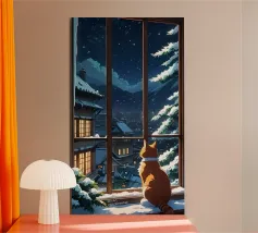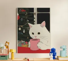 Questo dipinto raffigura un gatto bianco seduto sul davanzale di una finestra, che guarda un paesaggio innevato con alberi spogli. L'interno è accogliente, con una tazza e un capo d'abbigliamento sul davanzale, a suggerire calore e comfort all'interno.