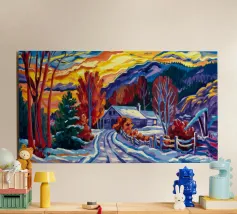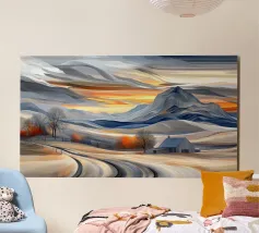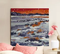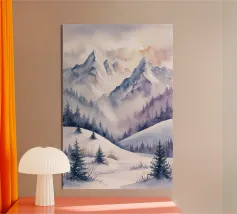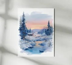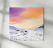 Paesaggio invernale acquerellato al tramonto in arancione, rosa e viola