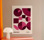 Un sofisticato poster astratto geometrico in stile Bauhaus con un'elaborata composizione di linee, cerchi e quadrati che si intersecano. Il disegno è caratterizzato da forme sovrapposte e da una splendida miscela di rosa vivaci e di marrone/bordeaux intenso, su uno sfondo bianco crema. Questa stampa incarna perfettamente i principi modernisti di forma e funzione. Questo file d'arte digitale di prima qualità viene fornito con una risoluzione eccezionale di 7000x5000 pixel, 300 dpi, che garantisce una qualità di stampa eccellente e nitida per il vostro arredamento murale contemporaneo o di ispirazione vintage.