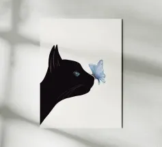Un tranquillo momento di meraviglia catturato in movimento. Chasing Light ritrae un piccolo gattino nero sospeso tra terra e cielo, proteso verso una fugace farfalla blu. Su uno sfondo caldo e dorato, la scena evoca l'innocenza, la curiosità e il desiderio universale di toccare qualcosa che è appena fuori portata. La pennellata strutturata e il delicato contrasto tra la pelliccia scura e la luce radiosa creano un senso di morbidezza e calore emotivo. Quest'opera d'arte bilancia la giocosità con l'immobilità poetica, rendendola un pezzo affascinante e riflessivo che invita alla riflessione e alla gioia.