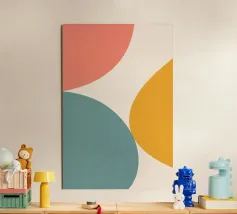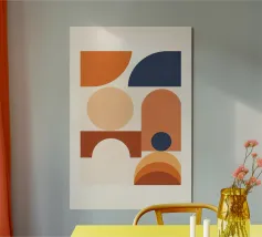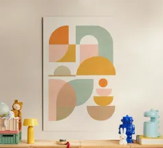 Questa moderna opera d'arte combina forme chiare con morbide sfumature di colore nei colori albicocca, rosato e blu petrolio. La composizione minimalista con due superfici semicircolari crea calma, equilibrio ed estetica elegante. Perfetta per gli interni moderni e scandinavi e per tutti coloro che amano l'arte murale calma con un accento di colore.