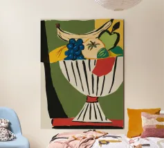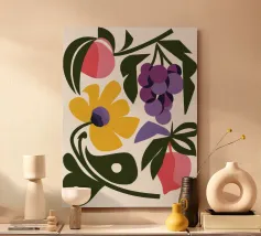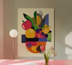 "Grape Array: Diversity in a Glass" presenta una vivace collezione di grappoli d'uva all'interno di un elegante bicchiere da vino, che simboleggia l'armonia nella diversità. Questo pezzo di grande effetto celebra la bellezza della varietà e dell'unità attraverso i colori della natura.