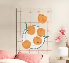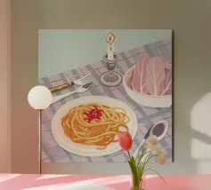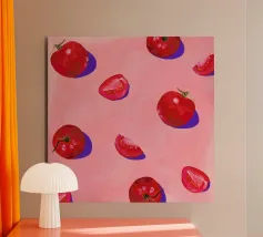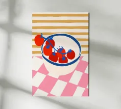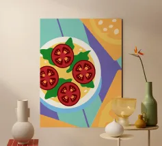 In questo studio minimalista di grande impatto, fette di pomodoro rosso vivo sono disposte con precisione su un piatto su uno sfondo bianco a griglia. La composizione è un gioco grafico di forme, colori e motivi che trova la bellezza nella semplicità e nella precisione geometrica.