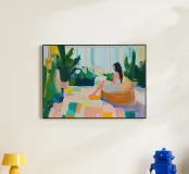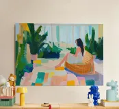 Un'allegra ed espressiva pittura digitale ad alta risoluzione che cattura perfettamente l'estetica "Indoor Jungle" o Jungalow. La scena raffigura una donna seduta a piedi nudi su un pouf o una sedia intrecciata di colore ocra, che osserva le rigogliose piante da interno di grandi dimensioni che la circondano in una sala da sole. Lo stile artistico è audace e astratto, con pennellate visibili e grosse, particolarmente evidenti nel motivo massimalista del pavimento, composto da quadrati giustapposti in giallo, rosa, acqua e pesca. Il dipinto utilizza una tavolozza vibrante di verde smeraldo, giallo sole e tenui blu pastello per creare un'atmosfera invitante, Dopamina Decor
