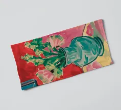 Un vaso blu turchese brillante racchiude un rigoglioso bouquet di fiori viola, rosa e rossi, disposti in modo drammatico su una superficie zebrata su uno sfondo rosso intenso.