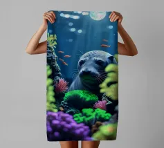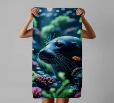 Una foca maculata scivola pacificamente tra le dolci onde, circondata da coralli che brillano nelle calde tonalità dell'oro e del blush. Quest'opera d'arte rivela il lato tenero dell'oceano: calmo, radioso e pieno di bellezze estetiche sotto la superficie baciata dalla luce del sole. Immaginato da Trinkets NL Design Studio, visualizzato con l'aiuto dell'AI.