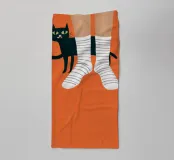 Illustrazione umoristica e affascinante di un gatto nero giocherellone che attacca i calzini ai piedi di una persona. La semplice composizione su uno sfondo arancione è un'istantanea simpatica, divertente e realistica della vita con un gatto.