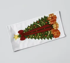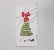 Disegno di un pino verde con neve e un fiocco rosso con citazione di Natale