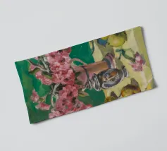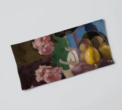 Un'audace natura morta con vivaci fiori rosso-rosa, forse papaveri o gerani, in un semplice vaso, accanto a fresche pere verdi, il tutto su una ricca tovaglia rossa che contrasta nettamente con uno sfondo blu intenso.